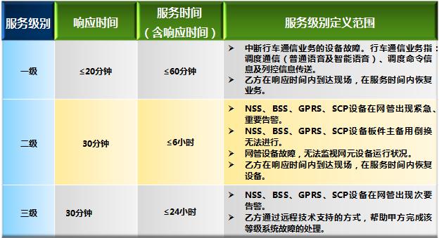 服务级别共分三级: 一级服务:提供远程技术支持、技术指导、复杂问题的现场处理等基本的维修服务 二级服务:在一级的基础上提供每季度一次的定期维护及巡回检查,具体见“服务承诺”。 定期维护及巡回检查:是主动了解和听取局方意见,检查系统运行状况,测试系统运行指标和参数,处理局方提出的、测试发现的问题和故障,检查遗留问题处理情况,使系统更加稳定运行。对系统的运行状态进行分析,找出存在的问题并进行解决,同时对采集信号进行抽测。 三级服务:在二级服务的基础上还提供每年一次的对系统的全面测试和标定。 测试和标定:对监控系统按每个测点进行全面的逐点测试和校正,使数据精度/准确度、响应时间达到运行指标。