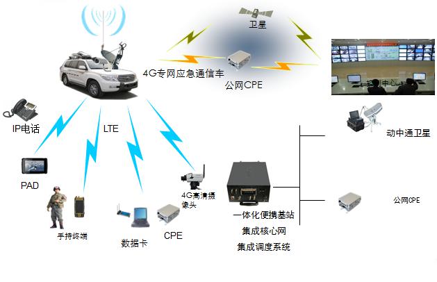 应急通信车内配备一体化便携基站,集成核心网和调度台,应急通信车周边人员可通过各类终端接入LTE专网;