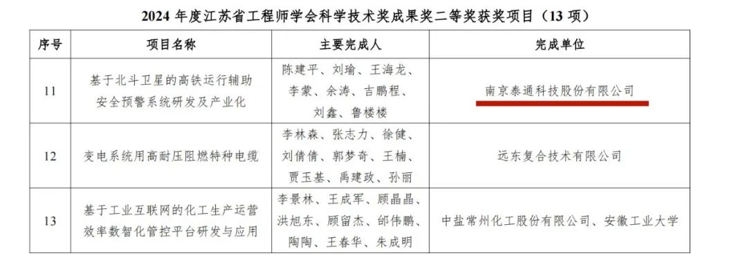由泰通科技独立完成的“基于北斗卫星的高铁运行辅助安全预警系统研发及产业化”项目,经过层层评审,从诸多申报项目中脱颖而出,荣获“2024年度江苏省工程师学会科学技术奖成果奖二等奖”。